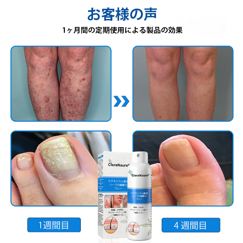 CleraNature® マグネシウム修復スプレーは、肌に深く浸透し、乾癬によるかゆみや炎症を穏やかに和らげ、素早く効果を発揮します。このステロイドフリーで刺激の少ないフォーミュラは、敏感な肌や弱った肌にも安全です。CleraNature® は、過剰な皮膚細胞の増殖を調節し、赤み、かさつき、ひりひり感を和らげ、肌の自然なバリアを修復し、健康な肌へと導きます。